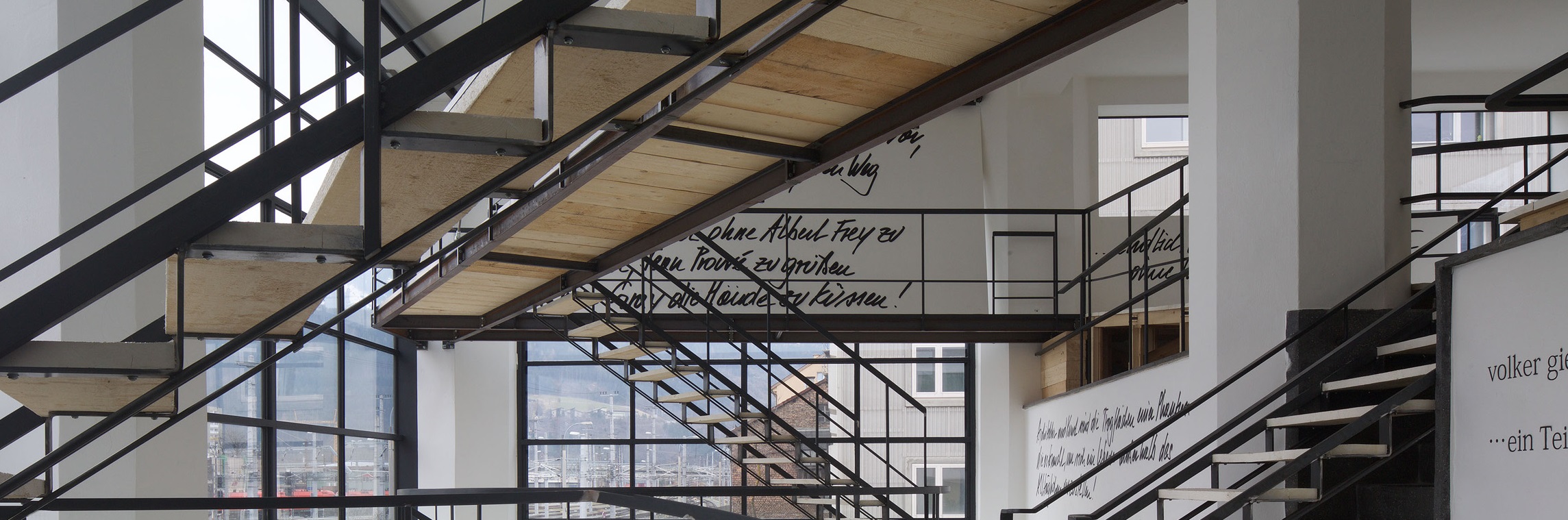 "In his exhibition A part of speech, Volker Giencke transforms the available spatial structure of Adambräu to thematise both movement in the space and the way in which the space is perceived. The exhibition becomes an architectonic project that makes it possible to physically experience Giencke’s approach. Spatial perception and visionary perspectives on architecture are revealed to visitors in text form, making perceptible the concrete utopia that Giencke calls for when teaching and in his projects." Arno Ritter