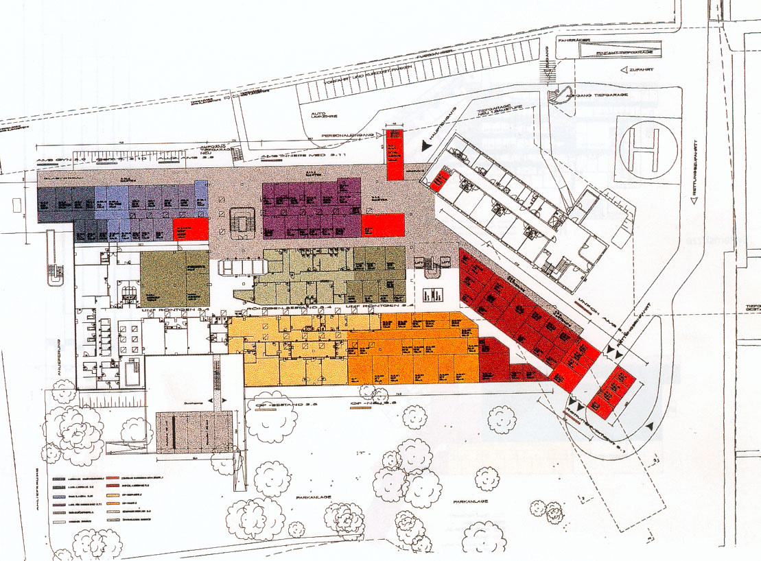 An attempt is also made to substantially improve the staff's and inpatients' situation by means of facade technology and lighting engineering. The renovation and enlargement of the operating tract and all present outpatient clinics, the reconstruction of the Intensive Care, Traumatology and Psychotherapy Divisions, the heliport, the mother-and-child house and the personnel tract, as well as the comprehensive adaptation of the existing inpatient unit and other buildings to current and forthcoming standards, altogether act to realize a novel type of hospital.